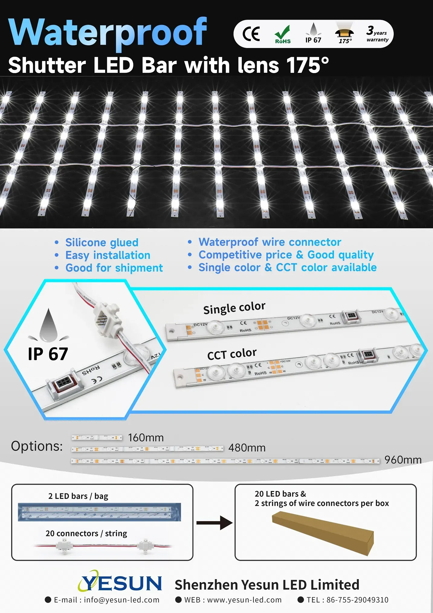 IP67 solderless shutter LED Bar with 175° Lens - SCW & CCT color option