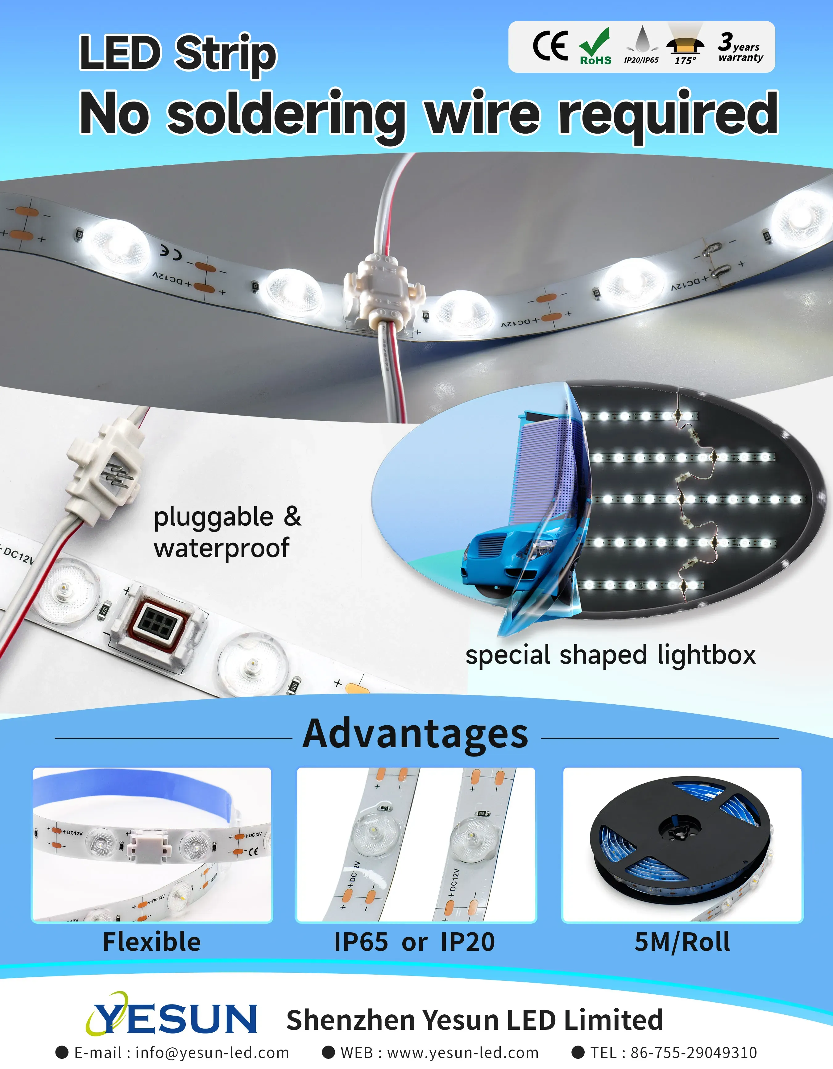 Solder free flexible led strip with 175° lens