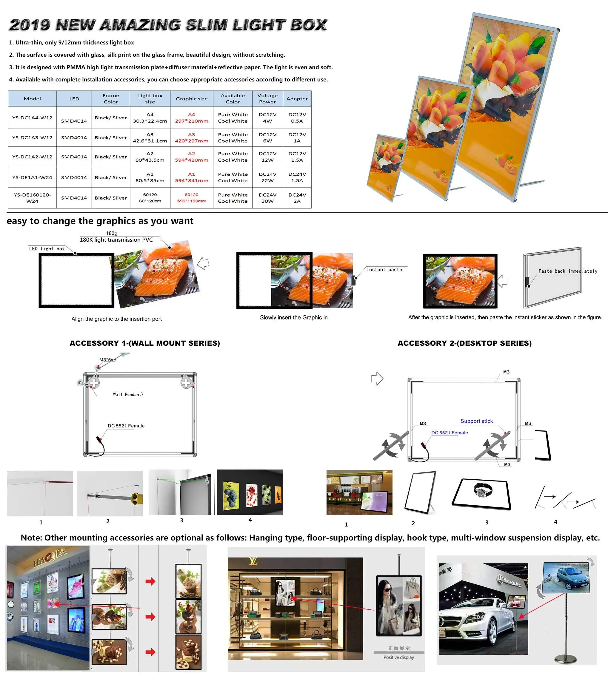 Ultra Slim 9mm & 12mm Menu light box, multiple accessories for option